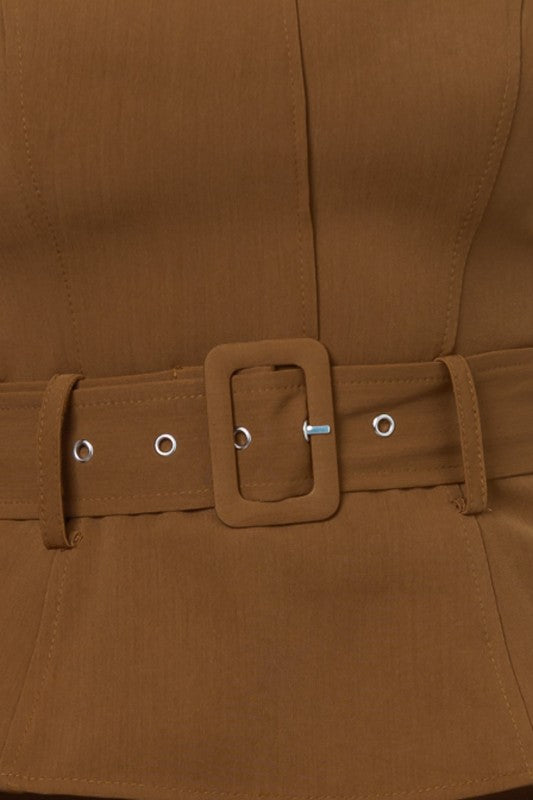 Style: V-neck Line Layered Top and Pants Set -Stretch: No Stretch -Color: Brown Multi -Pattern Type: Solid -Details: Cinched Waist, Adjustable Belt, Side Zipper Shirt, Front Zipper Pants, Collar, V-neck, Long Sleeve. -Neck Line: V-neck -Sleeve Length: Long Sleeve -Sleeve Type: Cuff Sleeve -Fit Type: Fit and Flare Model is wearing a size Small Imported Material: Self 95% POLYESTER 5% SPANDEX