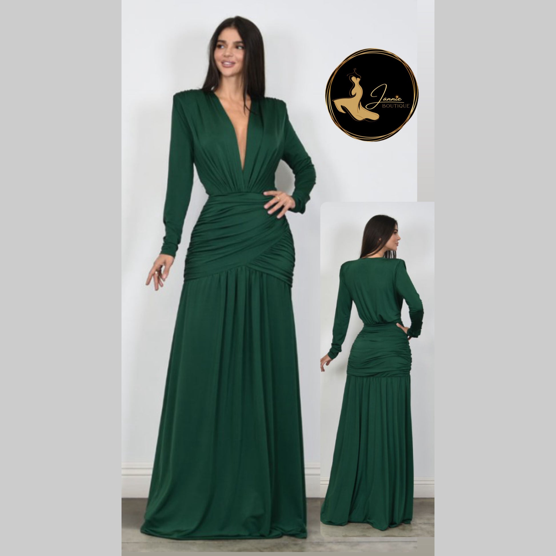This elegant green Camy maxi dress features a ruched design and long sleeves, creating a sophisticated and stylish silhouette. Perfect for any occasion, this dress offers both comfort and style.