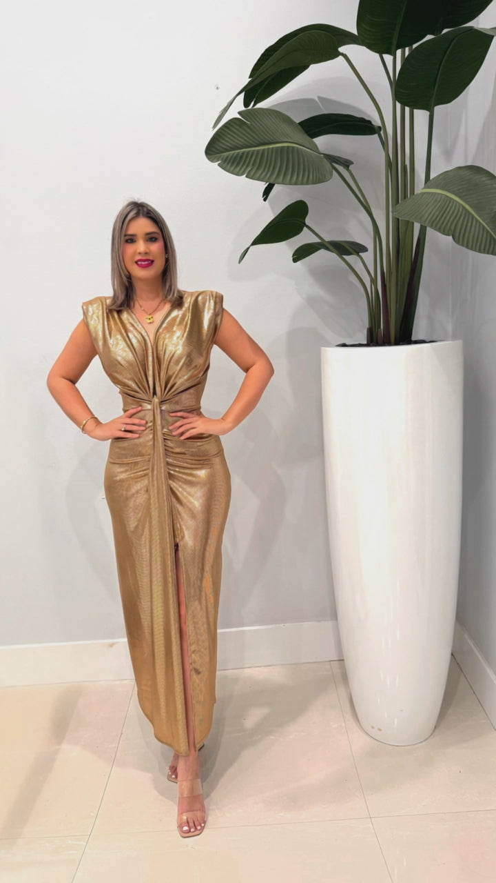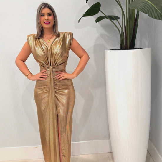 Elevate your style with our stunning Gold Midi Dress. Its ruched detailing and open leg design add a sexy touch, while the one size fit and stretch fabric ensure maximum comfort. Perfect for any occasion, this dress is a must-have in your wardrobe.