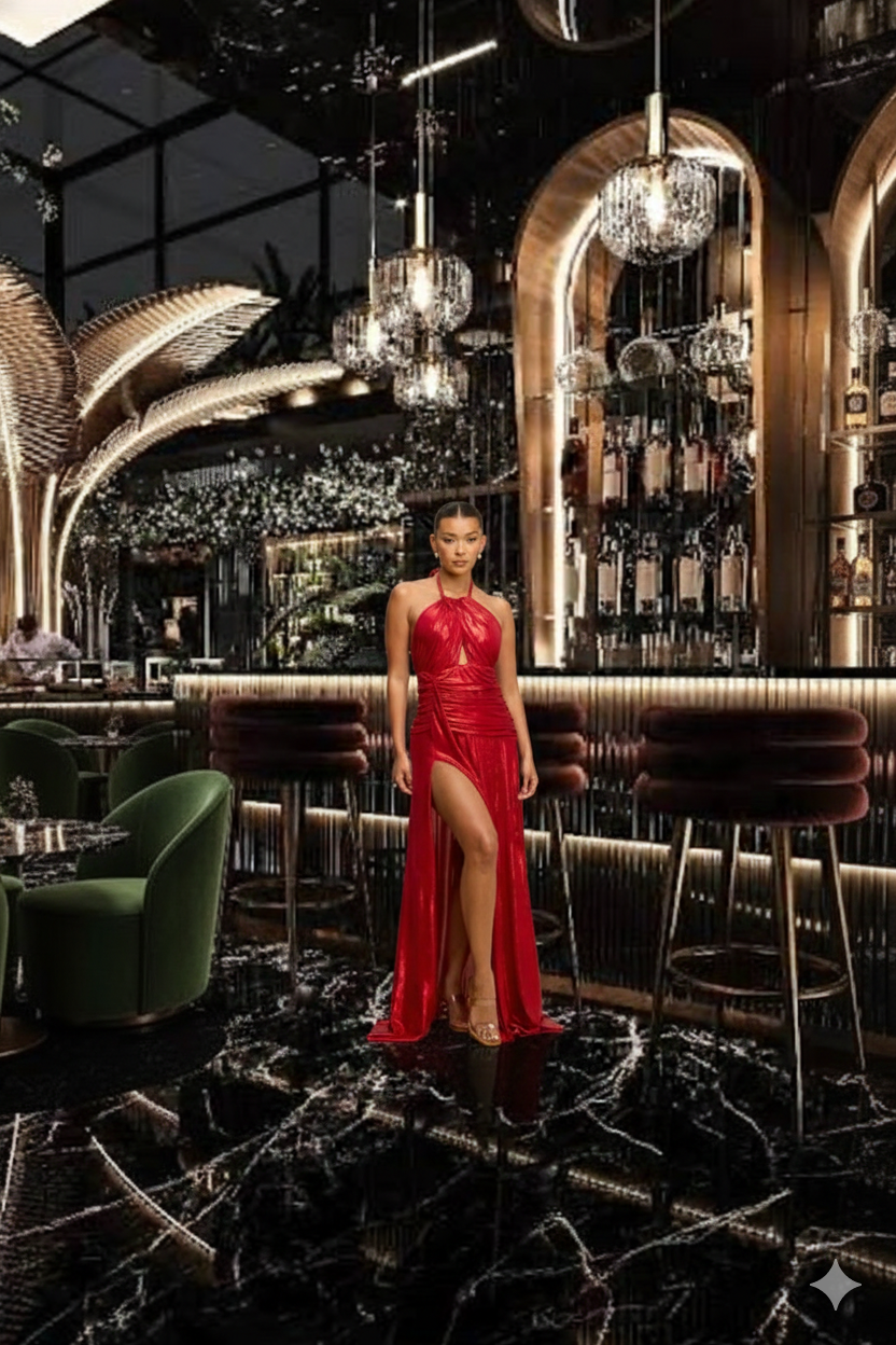The Red Metallic Halter Maxi Dress features a striking metallic finish, designed to enhance elegance while providing a flattering silhouette. The halter neckline offers support, making it suitable for various occasions, while the maxi length ensures comfort and a sophisticated appearance. Ideal for evening events or formal gatherings.
